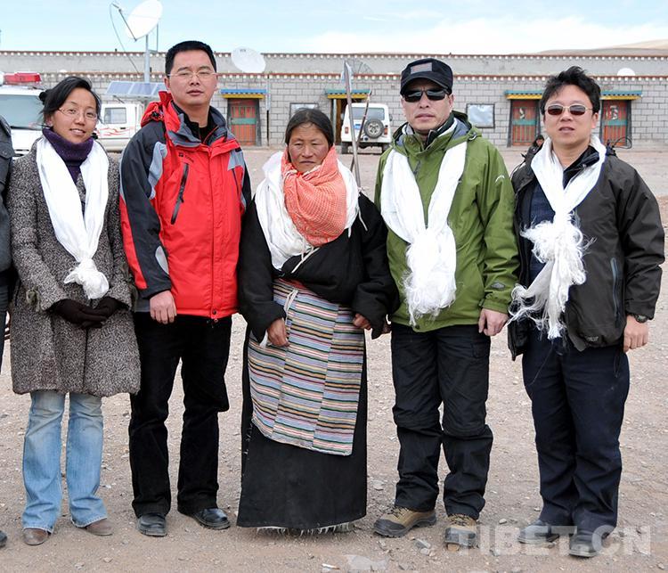 圖為中國石化第五批援藏干部、班戈縣副書記陳志清(左二)和常務(wù)副縣長潘峰(右一)專程到班戈縣新吉鄉(xiāng)接脖子下長著巨大腫瘤的牧女斯求卓瑪進(jìn)京治病時,在鄉(xiāng)政府一同合影留念(王普2010年3月26日攝)
