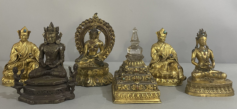 其中,5件金銅佛造像和1件銅鎏金水晶嵌寶石供養(yǎng)塔制作工藝精良,專家建議暫定為三級(jí)文物。特別是1尊明末清初的黃銅同侍從無(wú)量壽佛造像,呈現(xiàn)出顯著漢藏融合風(fēng)格,其六面形臺(tái)座多見(jiàn)于漢藏風(fēng)格唐卡與壁畫(huà),在銅造像中較為罕見(jiàn)。