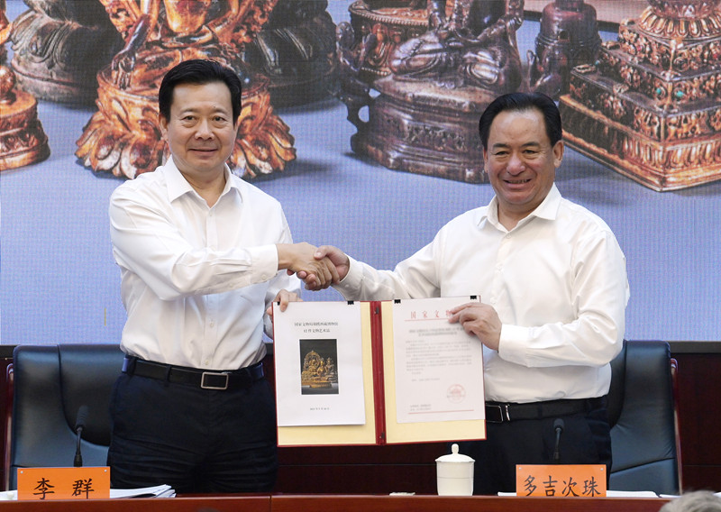 圖為文化和旅游部副部長(zhǎng)、國(guó)家文物局局長(zhǎng)李群(左)與西藏自治區(qū)人民政府副主席多吉次珠交接文物劃撥清冊(cè) 國(guó)家文物局供圖 攝影:新華社記者 李賀
