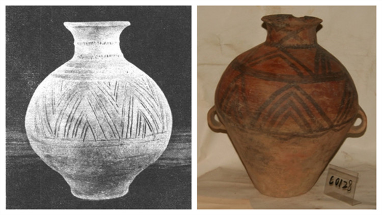 左圖為卡若遺址出土的陶罐 圖片翻拍自《昌都卡若》考古發(fā)掘報(bào)告;右圖為甘肅馬家窯文化三角折線紋彩陶壺 圖片來源于馬家窯文化官網(wǎng)