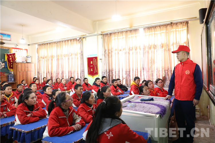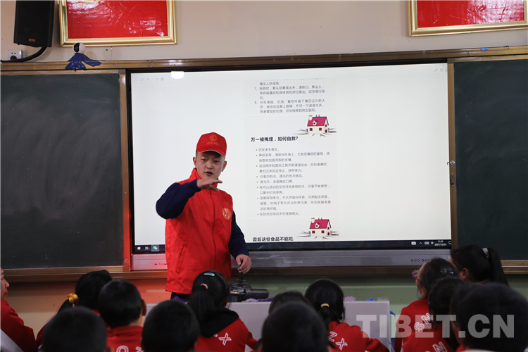 圖為那曲市森林消防大隊(duì)志愿者來到駐地附屬中學(xué)為師生們講解地震自救相關(guān)常識(shí)