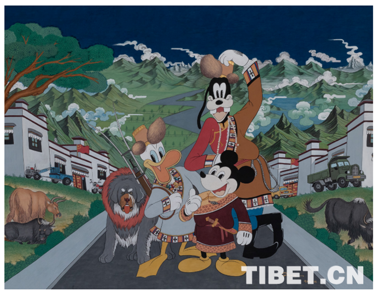 唐卡藝術(shù)家邊巴的新唐卡《逛新城》,同樣的青山綠水,同樣的社會主義新農(nóng)村,不同的是,他讓米老鼠和唐老鴨穿上藏裝來做客了。隨著拉薩近年來的城市巨變,知名企業(yè)、品牌進駐城市,也以獨特的風(fēng)格資源和自身亮點成為旅游勝地,一個嶄新而充滿活力的現(xiàn)代化拉薩正在崛起。作品在傳統(tǒng)與現(xiàn)代之間所傳遞的沖撞與融合,展現(xiàn)的自信與從容,正是中華文化的主流價值所在。