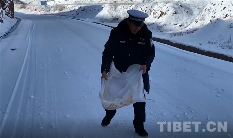 2018年3月,國道317突然遭遇了暴雪天氣,許多群眾和車輛被困在了矮拉山山頂,扎西四郎跟著隊友們在零下三十多度的惡劣環(huán)境下堅守了28天。令扎西四郎印象最深刻的是有一次,因為車子沒辦法通行,隊長指揮民警帶群眾下山。當時,有一位要去拉薩的老奶奶腿腳不方便,她自己根本就沒辦法走動,扎西四郎就和桑珠一起輪流背著老人下山,雖然中間滑倒了幾次,可還是把老人背到了能通車的安全位置,老人為了表達感激,還專門給他們留下了拉薩的住址和聯(lián)系電話。