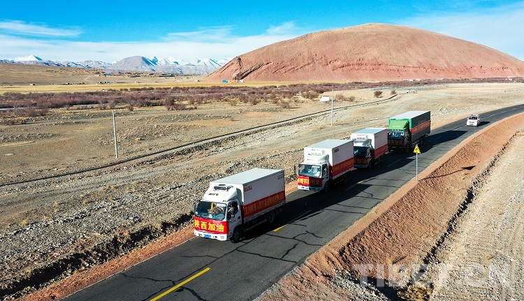 圖為運(yùn)送阿里馳援陜西疫情防控保障物資的貨車從獅泉河出發(fā) 攝影:普索朗