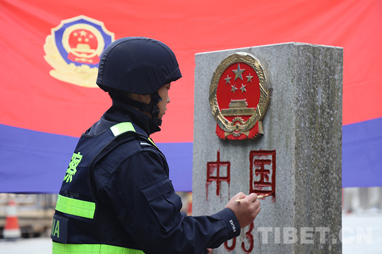 圖為友誼橋執(zhí)勤點民警歐珠次仁在警察節(jié)來臨之際為界碑描紅