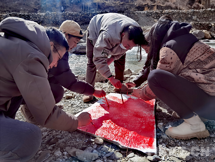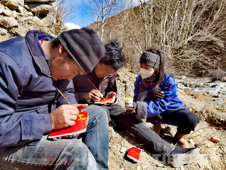圖為卡熱鄉(xiāng)6個(gè)村(居)第一書記及邊據(jù)村駐村工作隊(duì)正在石頭上手繪國(guó)旗