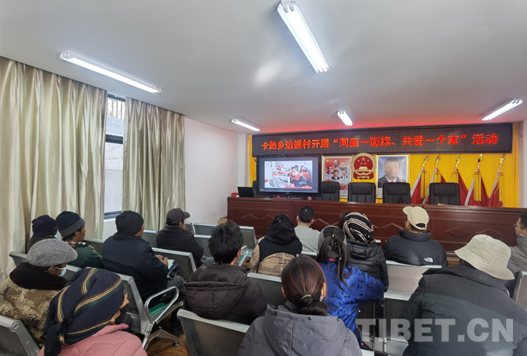 圖為卡熱鄉(xiāng)6個(gè)村(居)第一書記和邊據(jù)村黨員、群眾代表正在觀看講述西藏各族人民愛(ài)護(hù)國(guó)旗的視頻