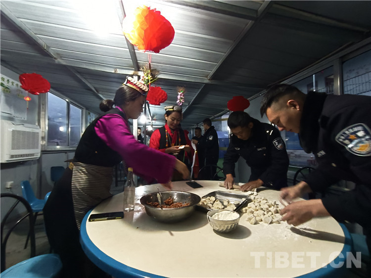 “阿久(藏語音譯:大叔),包餃子得講究手法,你要把餡放皮中央。”民警陳國云邊講解邊演示,一個個餃子范本整整齊齊擺在托盤上。香腸、臘肉、餃子、羊肉、雞湯、糌粑、火鍋.....一桌藏漢式的年夜飯準備完畢,大家圍坐在圓桌旁,舉杯共祝新春,濃濃的年味兒在夏爾巴第一村溢出,教導員康林感嘆道:“雖然春節(jié)不能回家,但是我們就是一個大家,祝大家新年快樂,扎西德勒!”