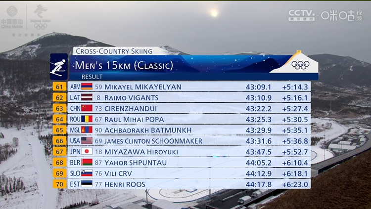 據(jù)悉,本場比賽共有99名運(yùn)動(dòng)員參加,每間隔30秒出發(fā)一人,運(yùn)動(dòng)員需在全長7.5公里的越野滑雪賽道上完成兩圈比賽。次仁占堆以第73名的序位出發(fā),與次仁占堆一起參賽的中國選手還有尚金財(cái)、哈得斯·巴德里汗、劉榮勝。最終尚金財(cái)排名第41位,劉榮勝排名第47位,哈得斯·巴德里汗排名第57位,次仁占堆排名第63位。