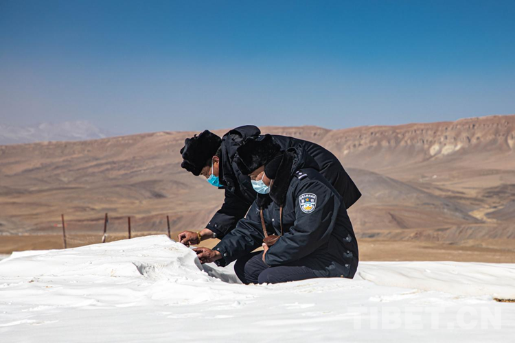 到達踏查點,那里有一個由大小差不多的石頭壘起來、高50厘米左右的半圓形石堆,這就是他們踏查的避風港。普瓊手執(zhí)國旗佇立在石頭上,嘎色拿出胸前的望遠鏡,觀察四周有無異樣。風不停地襲擾,但他們就像雕塑一樣,誓死捍衛(wèi)著腳下的領土。