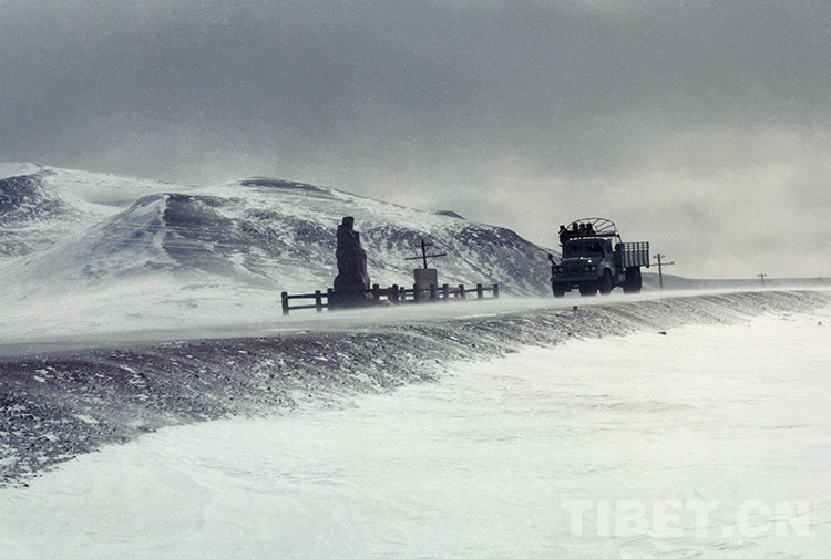 這是一輛汽車(chē)正在通過(guò)青藏公路海拔5231米的唐古拉山口(唐召明1991年攝)