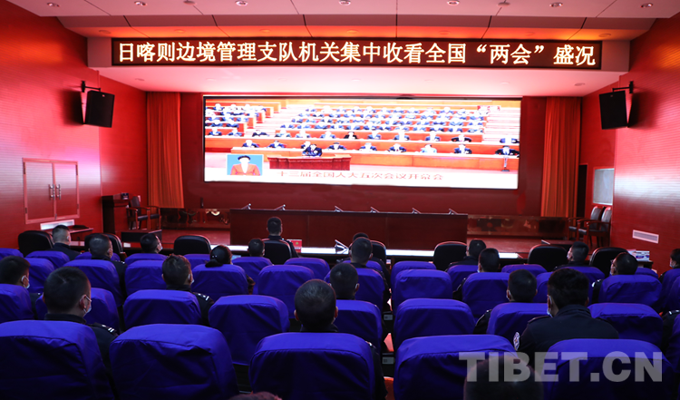 圖為日喀則邊境管理支隊(duì)機(jī)關(guān)民警收看兩會(huì)