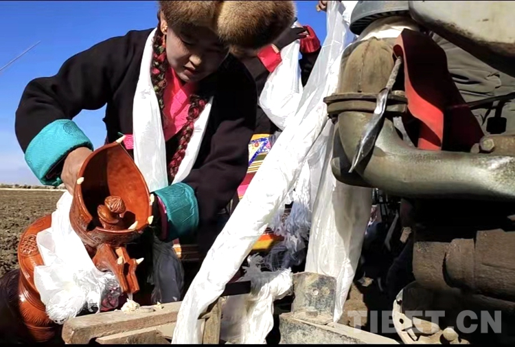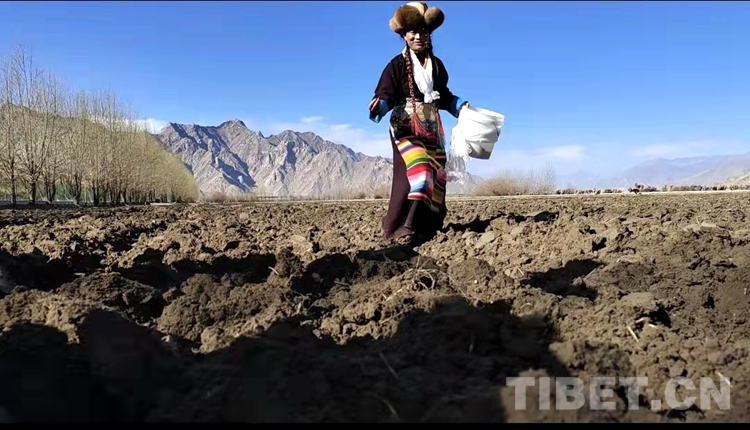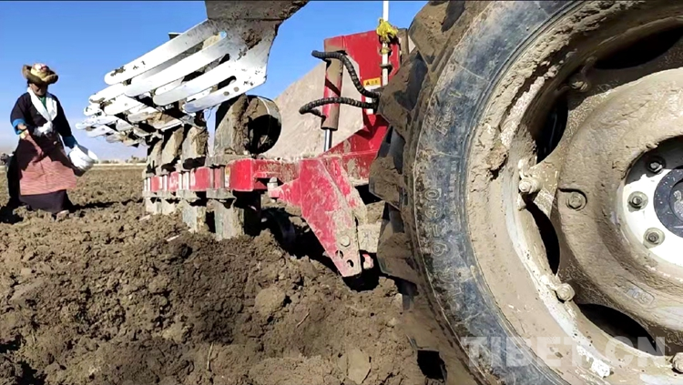 在雪水浸潤(rùn)過(guò)的肥沃土地上,深耕機(jī)車輪翻滾而過(guò),駛過(guò)的土地上翻起深色的泥土,婦女們跟在后面播撒青稞良種。現(xiàn)場(chǎng)一片轟鳴,熱鬧無(wú)比,廣袤、肥沃的土地上播種下了春天的希望。