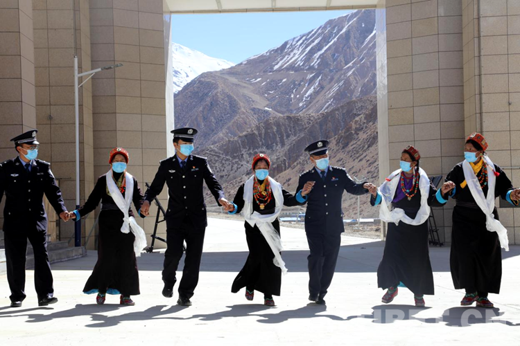 活動(dòng)中,邊民群眾與移民警察在國門下興高采烈地跳起了藏族傳統(tǒng)鍋莊舞,用歌聲和舞蹈表達(dá)他們的喜悅心情,以自己的方式慶祝這一不凡的日子。