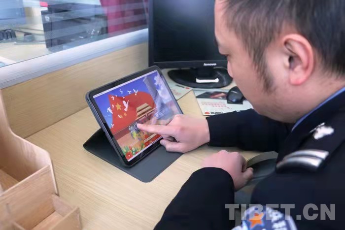 圖為西藏邊檢總站執(zhí)法調(diào)查支隊民警通過網(wǎng)上獻花向英烈表達敬意、寄托哀思 攝影:劉文