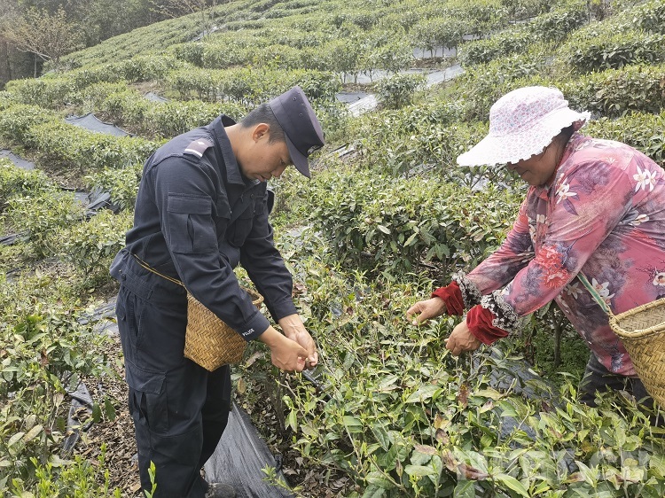 圖為民警在幫助茶農(nóng)采茶