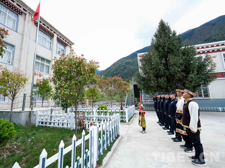來自派鎮(zhèn)雪卡村的5歲小女孩旦增玉珍在林芝邊境管理支隊(duì)派邊境派出所,與移民管理警察共同參加升旗儀式。還在上幼兒園的她,像學(xué)校里的哥哥姐姐們一樣,一邊敬禮一邊唱國歌,同派出所民警一起接受愛國主義熏陶。
