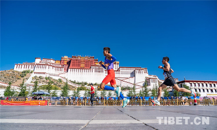圖為拉薩半程馬拉松比賽中運動健兒從布達(dá)拉宮前飛奔而過 攝影:趙耀