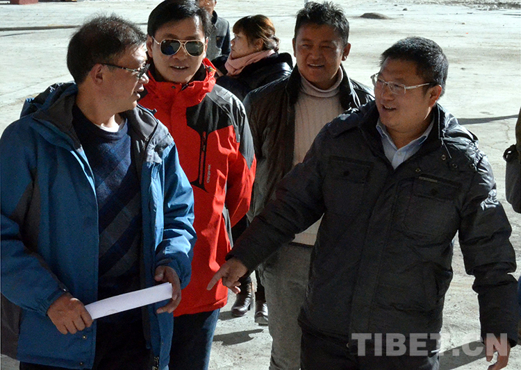 這是中國石化援藏干部王鵬雁(右一)在中國石化小學二期工程驗收現(xiàn)場同其他縣領(lǐng)導進行交流(扎西2014年10月25日攝)