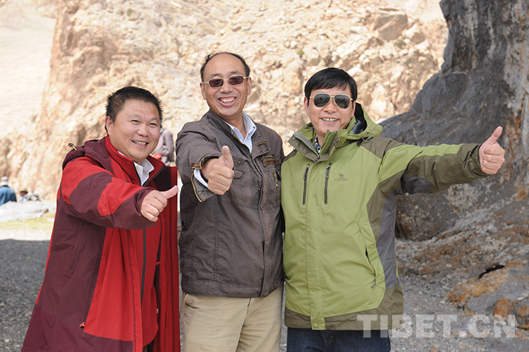 這是中國石化援藏干部王鵬雁(左)與一同援藏的常務副縣長王飛(右)及來采訪的新華社記者唐召明(中)合影留念(王琪2015年5月20日攝)