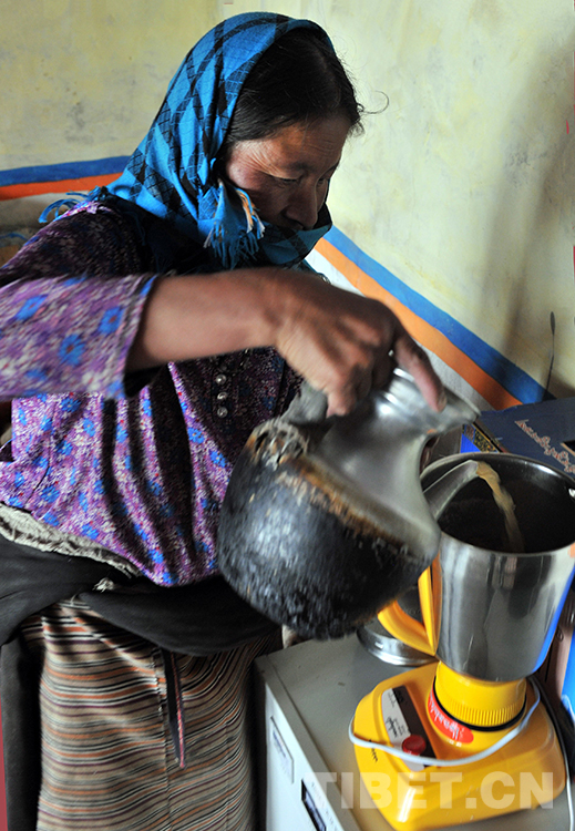 這是班戈縣新吉鄉(xiāng)術(shù)后的斯求卓瑪向放入酥油的電動(dòng)攪拌壺里倒茶水,準(zhǔn)備用電來打制酥油茶(唐召明2015年7月14日攝)