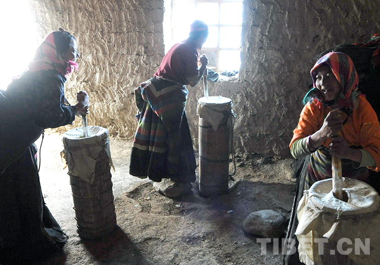 這是申扎縣申扎鎮(zhèn)三村專業(yè)合作經(jīng)濟(jì)組織的牧女,在使用傳統(tǒng)酥油桶打制酥油(唐召明2009年攝)