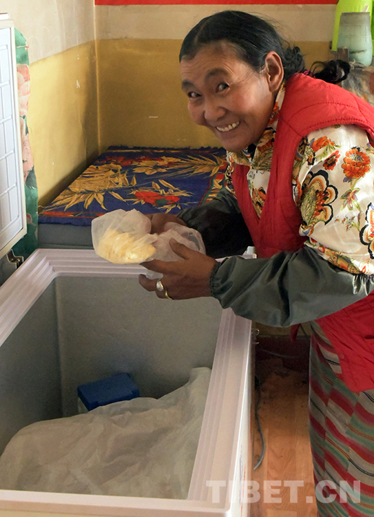 這是雙湖縣嘎措鄉(xiāng)牧女次仁朗加,使用家里的冰柜冷藏隨用隨取的酥油(唐召明2019年9月20日攝)