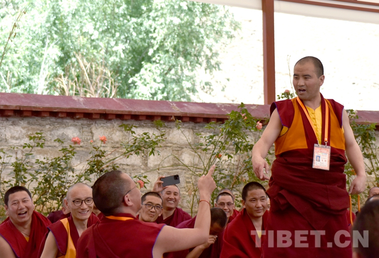 中國西藏網(wǎng)訊 身穿絳紅色袈裟,坐者仔細(xì)聆聽、站立者臂套念珠、迸出佛學(xué)妙語;圍觀者不時(shí)大笑……這是6月21日下午記者在西藏佛學(xué)院辯經(jīng)場看到的“唇槍舌戰(zhàn)”。