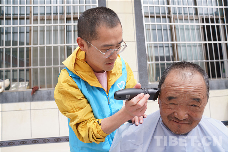 圖為青年志愿服務隊志愿者為老人理發(fā)