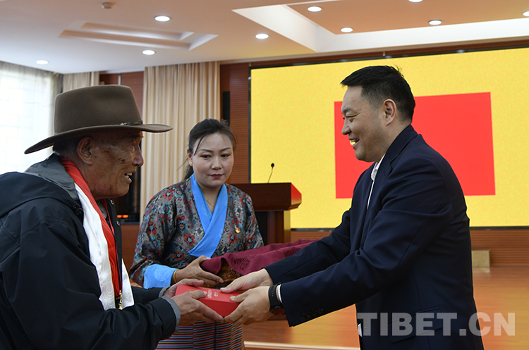圖為西藏自治區(qū)黨委常委、統(tǒng)戰(zhàn)部部長(zhǎng),自治區(qū)政協(xié)黨組副書(shū)記、副主席嘎瑪澤登向“光榮在黨50年”的老黨員頓珠多吉頒發(fā)紀(jì)念章 攝影:王媛媛