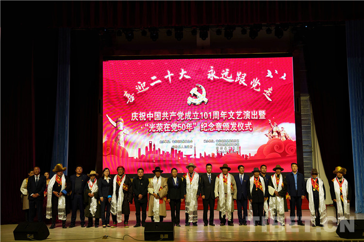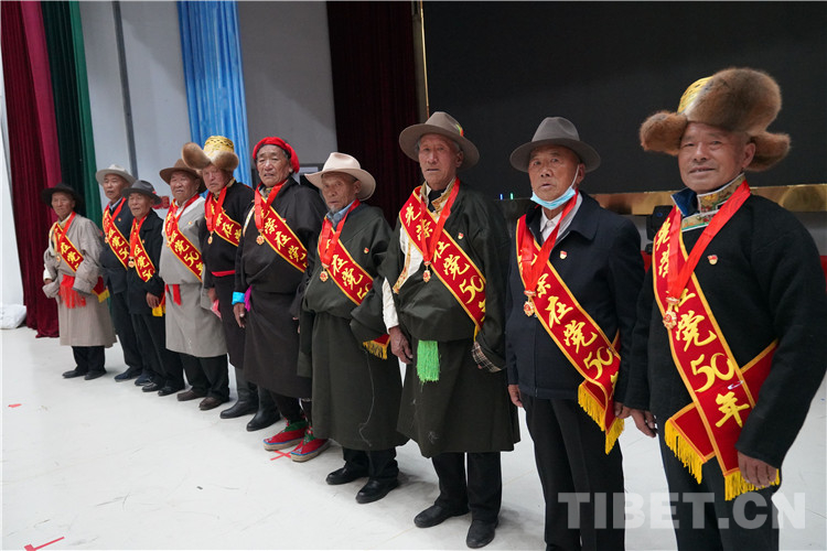 活動現(xiàn)場,為10名老黨員代表頒發(fā)了“光榮在黨50年”紀念章,敬獻了潔白的哈達。