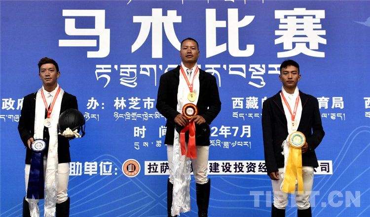 圖為7月17日競(jìng)技馬術(shù)項(xiàng)目場(chǎng)地障礙個(gè)人賽頒獎(jiǎng)現(xiàn)場(chǎng)(中間為冠軍選手日喀則市代表團(tuán)巴迪,左邊為亞軍選手山南市代表團(tuán)選手諾桑,右邊為季軍選手林芝市代表團(tuán)單增洛追) 攝影:德吉卓嘎