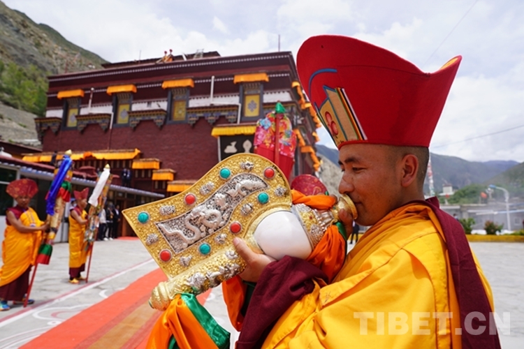 10時(shí)許,班禪抵達(dá)扎果寺。頓時(shí),法號(hào)長(zhǎng)鳴,鼓樂喧天,第六世德珠?加央西繞班旦活佛及僧眾以最隆重的宗教禮儀歡迎班禪的到來(lái)。