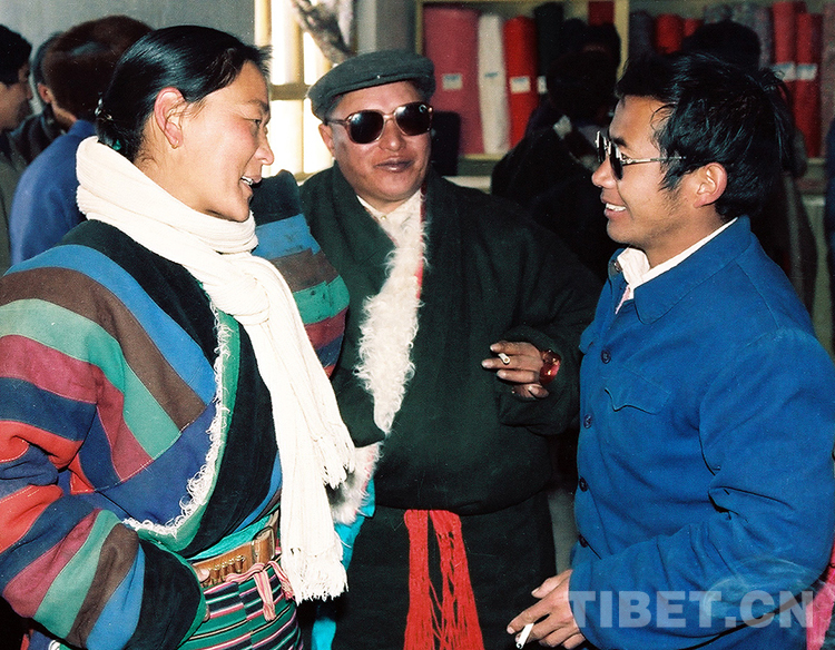 這是文部辦事處主任加央多吉(右)與參加那曲地區(qū)基層政權(quán)建設(shè)工作現(xiàn)場會的那曲縣縣長嘎瑪(左)在交流(唐召明1989年12月份攝)
