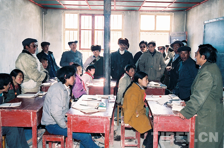 這是那曲地區(qū)“訪問團(tuán)”人員在參觀文部辦事處小學(xué)(唐召明1989年12月份攝)