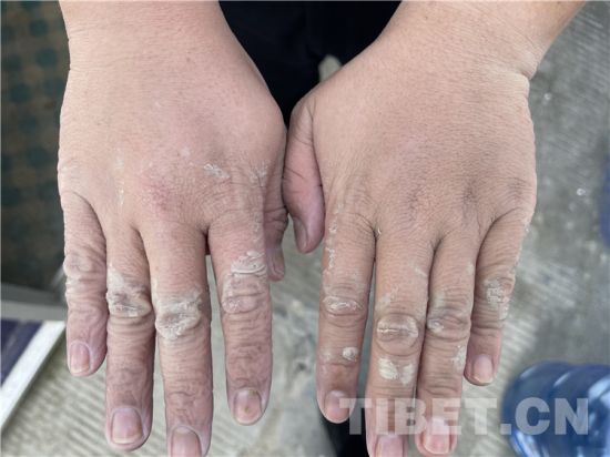 摘下戴了十幾個(gè)小時(shí)的手套,每根手指都被捂皺變形,關(guān)節(jié)處的皮膚泛白腫脹——看到日喀則邊境管理支隊(duì)吉隆邊境派出所民警桂浩的手部照片,讓人不禁淚目。