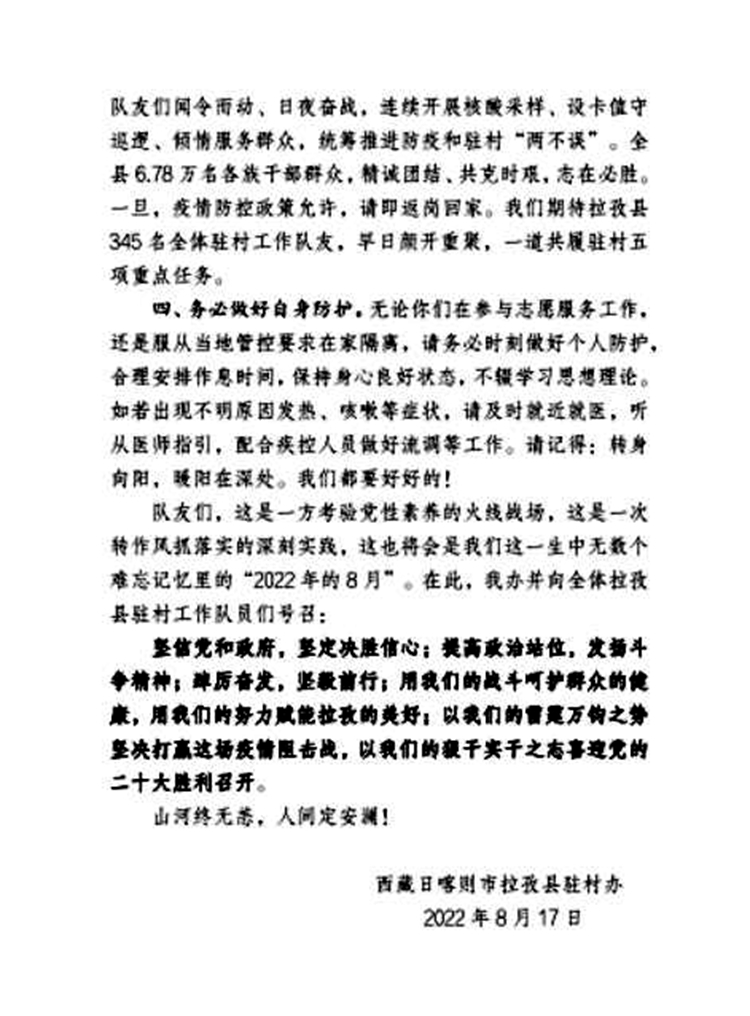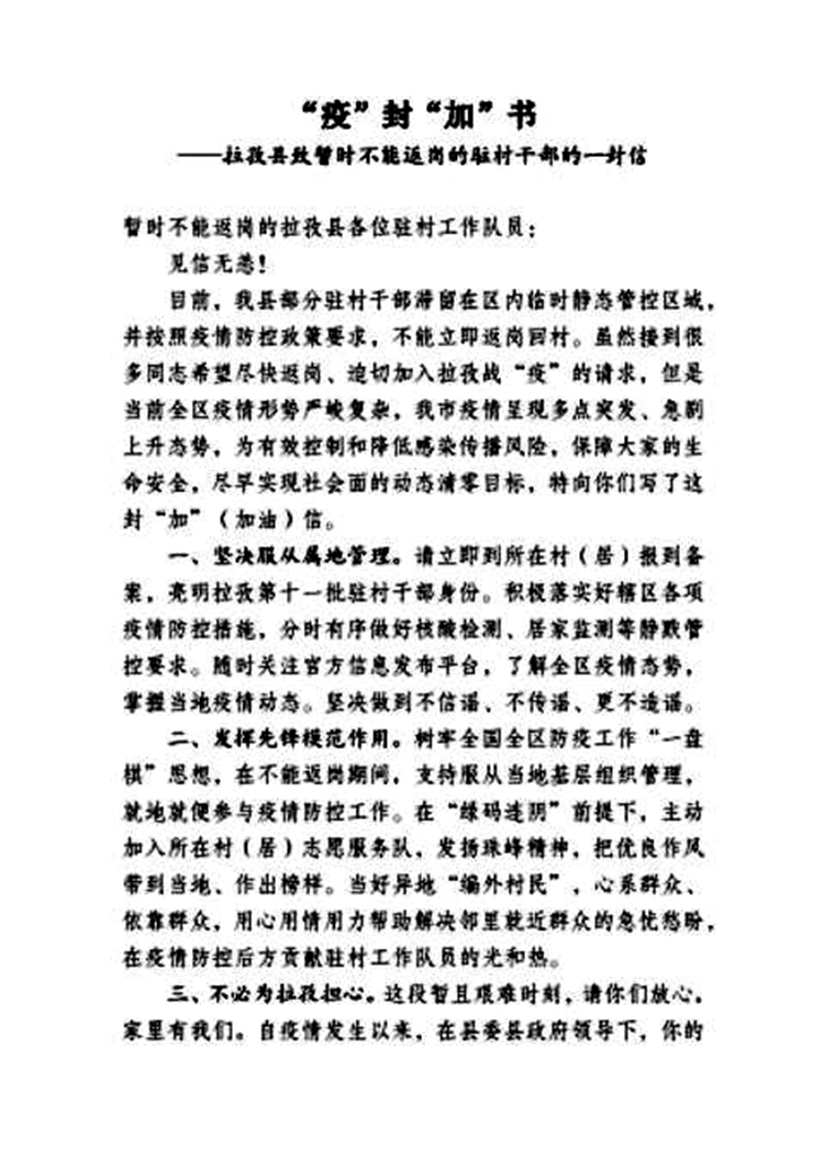 圖為西藏日喀則市拉孜縣駐村辦下發(fā)給無(wú)法返崗的駐村干部的一封信——“疫”封“加”書