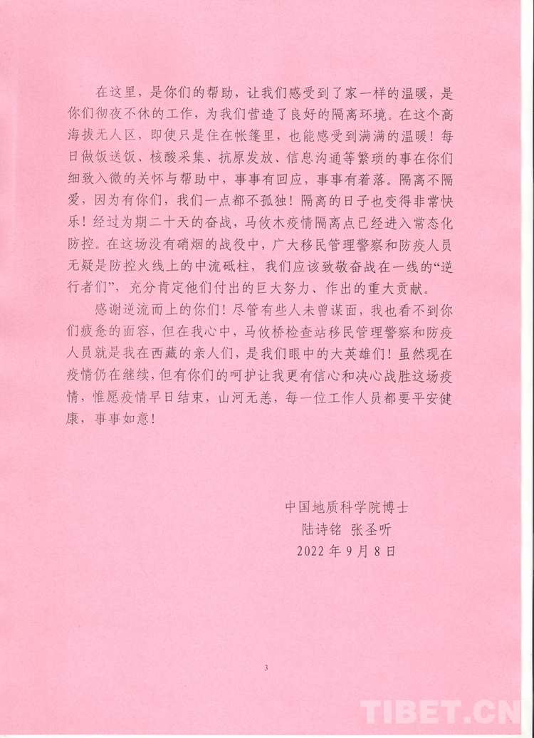 一次次走訪,一件件回應(yīng)……這一系列真實、暖心的舉動,讓馬攸橋邊境檢查站的民警與滯留群眾建立了深厚情誼,也讓2人滯留結(jié)束回到北京后,寫下了這封感謝信。陸詩鳴、張圣聽的真情流露,飽含著群眾對馬攸橋邊境檢查站民警的信任,讓這個海拔4900多米的臨時安置點顯得更加溫暖。(中國西藏網(wǎng) 通訊員/張拴根 唐彪 記者/次旦拉姆 馬攸橋邊境檢查站供圖)