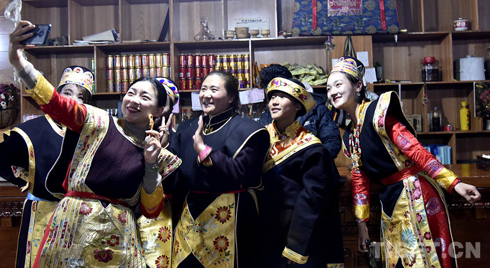 圖為工布新年“古突”夜,游客和當(dāng)?shù)厝罕娚碇⒀b合影留念(資料圖)