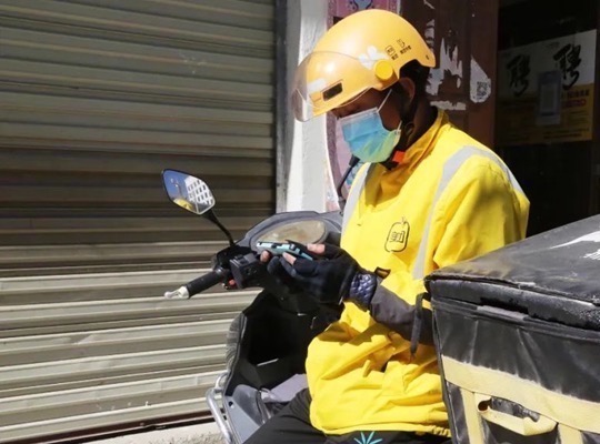 圖為山南市一名外賣騎手在收聽(tīng)收看黨的二十大開幕盛況
