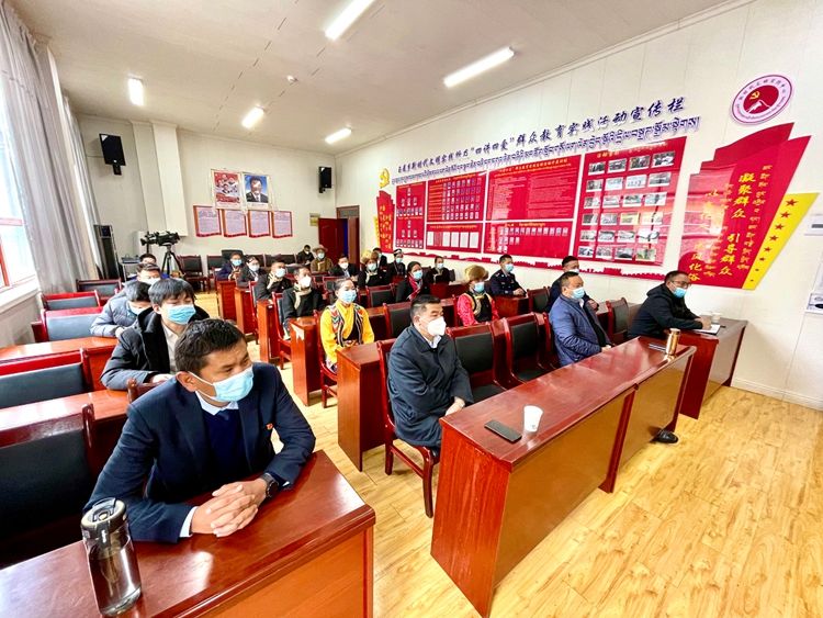 圖為山南市隆子縣玉麥鄉(xiāng)干部集中收聽(tīng)收看黨的二十大開幕盛況