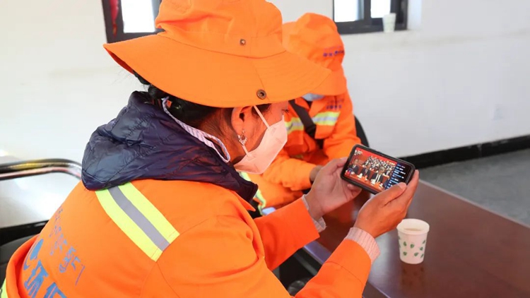 圖為山南市環(huán)衛(wèi)工人在收聽(tīng)收看黨的二十大開幕盛況。