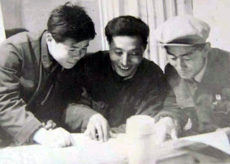 這是李業(yè)壯(左)在那曲地區(qū)農(nóng)機(jī)廠工作時(shí),與藏族副廠長(zhǎng)典地(中)、藏族技術(shù)員覺吉(右)一同研究開發(fā)新產(chǎn)品 (唐召明提供,1978年攝)