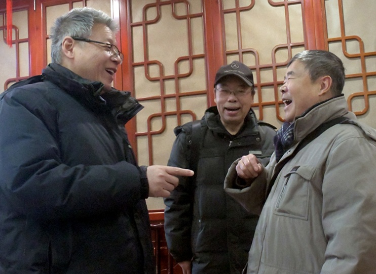 這是北京建藏援藏工作者協(xié)會(huì)原會(huì)長(zhǎng)范小建(左)、原副會(huì)長(zhǎng)羅廣武(中)和李業(yè)壯(右)在暢談西藏往事(唐召明2019年12月26日攝)