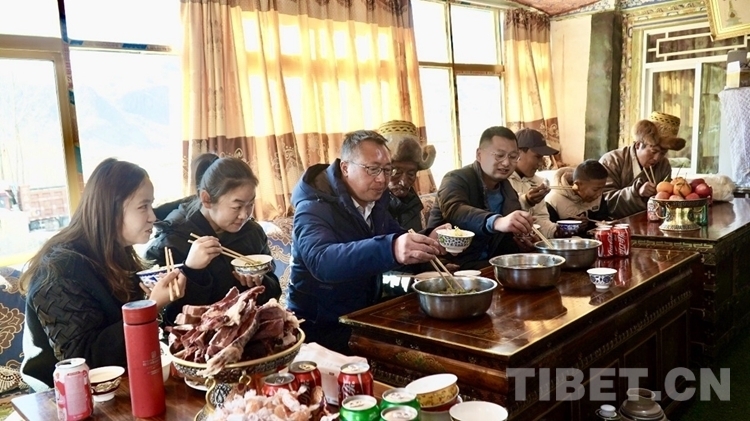 “這些干部和我們相處了這么長時間,都成自家人了。他們家在內地,但因為工作必須堅守崗位。我們能做的也不多,就是請他們到家中來吃個簡單的團圓飯?!?多章說著,老人的女兒央金熱情地端來酥油茶。
