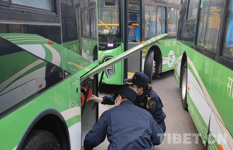 圖為拉薩海關(guān)所屬聶拉木海關(guān)監(jiān)管驗放出口國產(chǎn)新能源公交車 由拉薩海關(guān)供圖