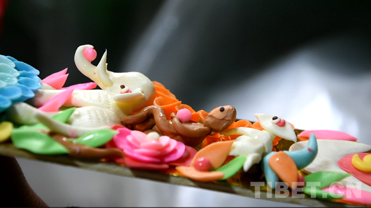 酥油花是藏民族雕塑藝術(shù)的一種特殊形式,它是以人物、花卉、樹木、飛禽、走獸等為主題的一種手工油塑藝術(shù),具有悠久的歷史。藏歷新年期間,西藏群眾會(huì)在切瑪盒的左右兩邊分別裝滿糌粑和炒青稞,然后在上面插上象征五谷豐登的“羅薩美朵”(彩色青稞穗)和寓意吉祥的酥油花。(中國西藏網(wǎng) 記者/次旦拉姆)
