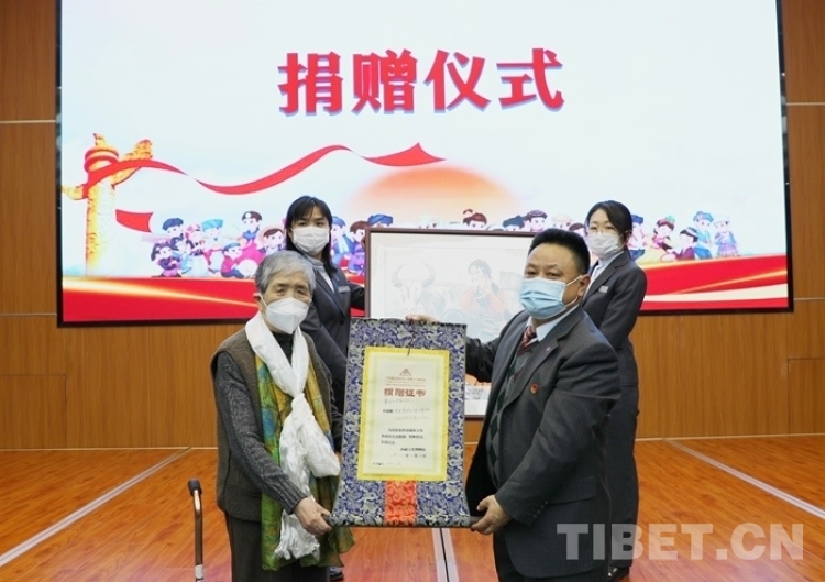圖為中國藏學研究中心西藏文化博物館向畫家吳茜女士(左)頒發(fā)捐贈證書