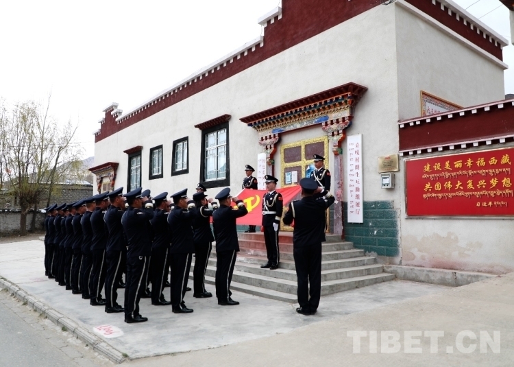 圖為山南邊境管理支隊機(jī)關(guān)黨員民警在乃東區(qū)結(jié)巴鄉(xiāng)朗生互助組展廳旁重溫入黨誓詞 攝影:鄭琦山