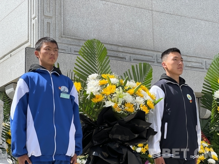 圖為拉薩那曲第一高級中學學生代表向革命先烈敬獻花籃 攝影:德吉卓瑪